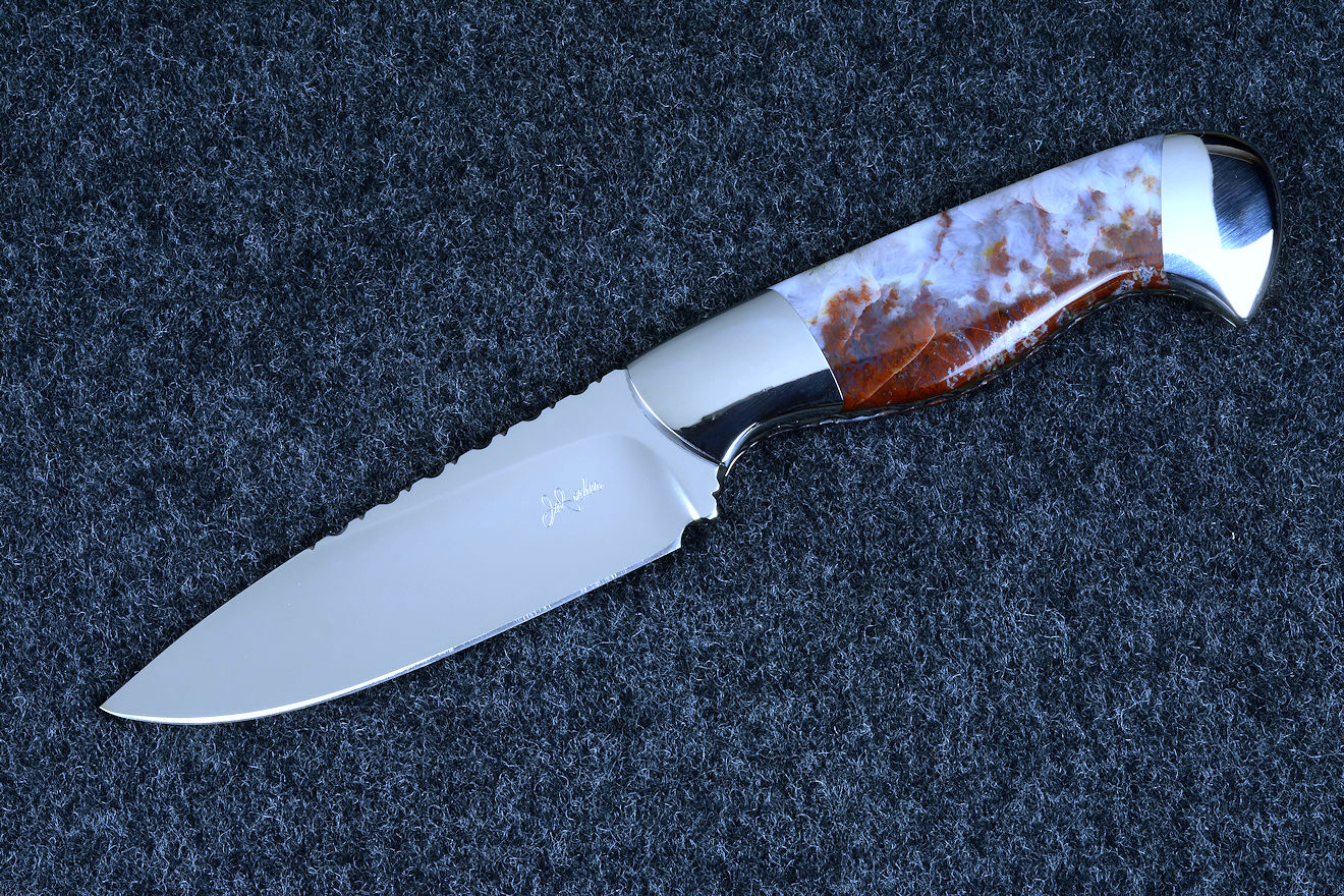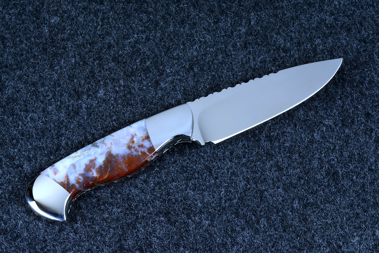 "Temno" fine handmade knife in T3 deep cryogenically treated ATS-34 high molybdenum martensitic stainless steel blade, 304 stainless steel bolsters, Bay of Fundy flame agate gemstone handle, shark skin inlaid in leather sheath "Temno" fine handmade knife, sheathed view in panel inlaid shark skin in 9-10 oz. leather shoulder, nylon thread "Temno" fine handmade knife, reverse side view in T3 deep cryogenically treated ATS-34 high molybdenum martensitic stainless steel blade, 304 stainless steel bolsters, Bay of Fundy flame agate gemstone handle, shark skin inlaid in leather sheath "Temno" fine handmade knife, spine detail view showing full filework, tapered tang and dovetailed gemstone and bolster fittings "Temno" fine handmade knife inside handle detail showing contoured gemstone and bolsters, full filework, fully tapered tang "Temno" obverse side view with maker's mark, in ATS-34 high molybdenum stainless steel blade, 304 stainless steel bolsters, Bay of Fundy flame agate gemstone handle "Temno" obverse side view with maker's mark, in ATS-34 high molybdenum stainless steel blade, 304 stainless steel bolsters, Bay of Fundy flame agate gemstone handle "Temno" reverse side view with maker's mark, in ATS-34 high molybdenum stainless steel blade, 304 stainless steel bolsters, Bay of Fundy flame agate gemstone handle "Temno" reverse side view with maker's mark, in ATS-34 high molybdenum stainless steel blade, 304 stainless steel bolsters, Bay of Fundy flame agate gemstone handle "Temno" reverse side gemstone handle detail, note the flames of carmine red in lavender-tinted white agate and numerous fossil forms in this 6 power enlargement "Temno" obverse side gemstone handle 6X enlargement, note billowing flames of carmine colored agate and white fossil forms in this hard and striking gemstone